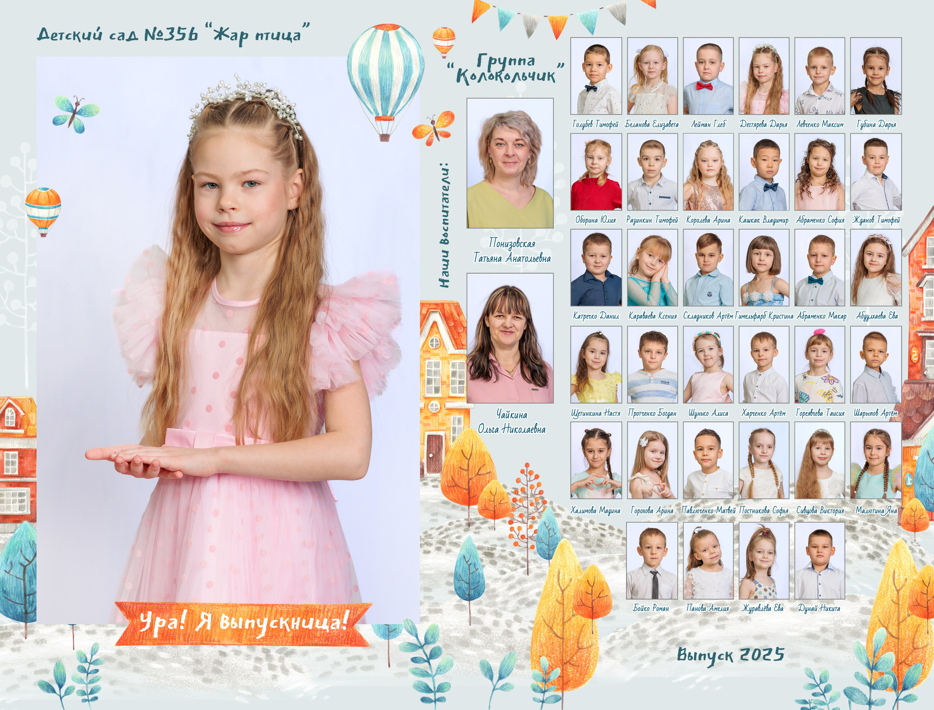 Выбор фотографий для альбома каждым родителем, с помощью нашего онлайн сервиса. Заполнение всей нужной информации для изготовления макета. Возможность заказать печать дополнительных фотографий, которые не вошли в альбом.